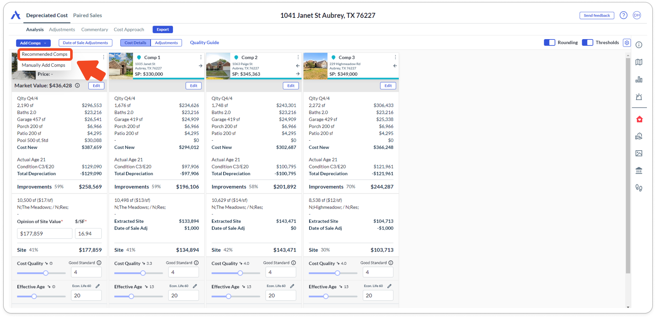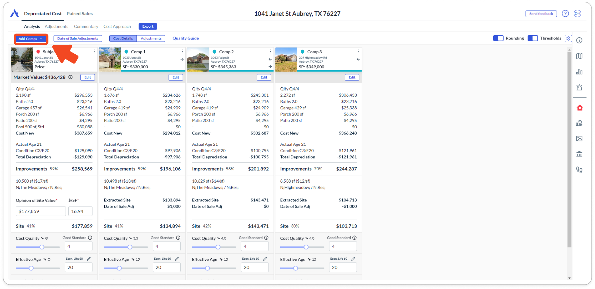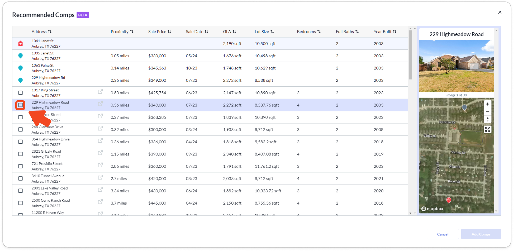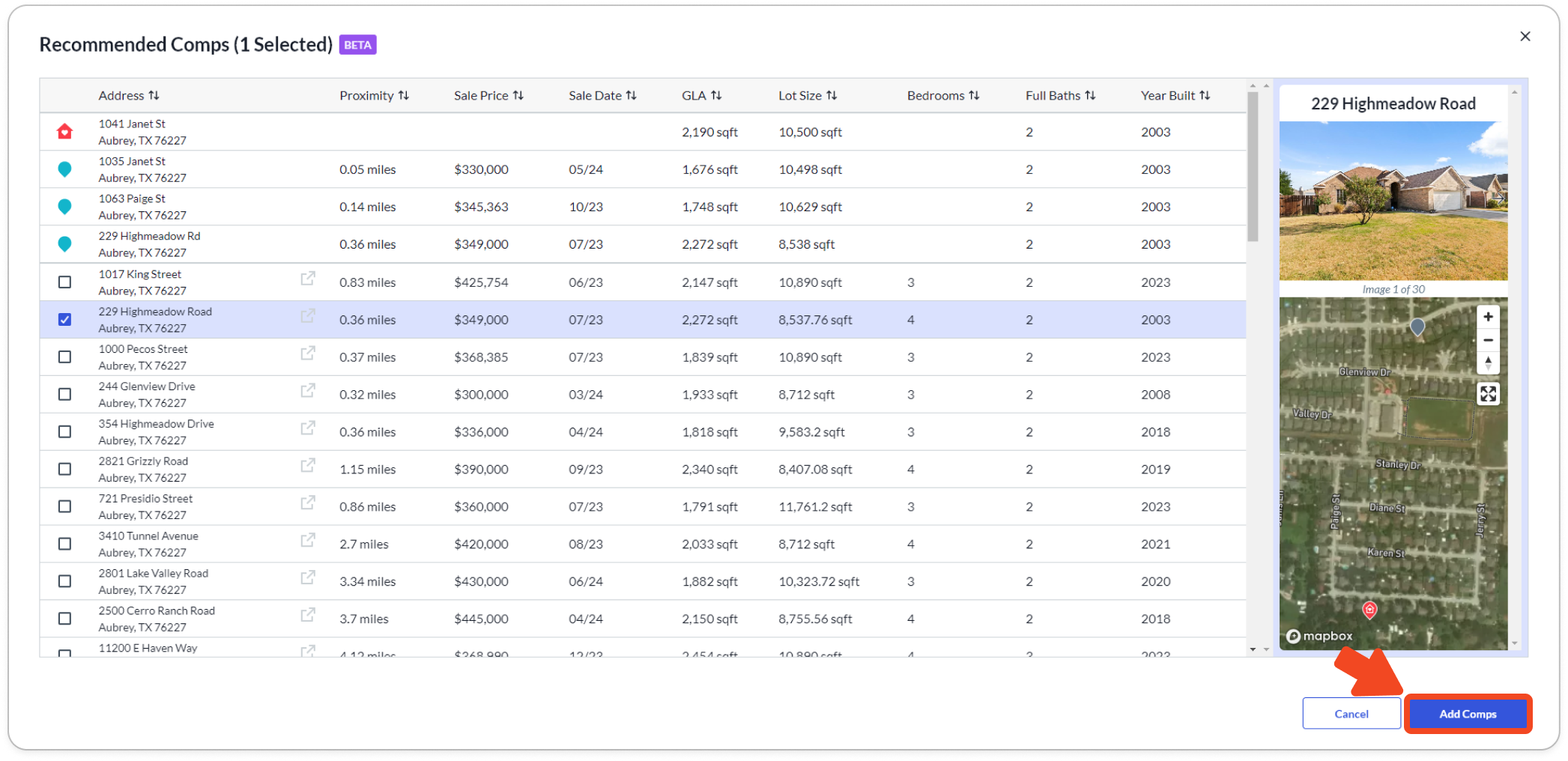 - Click "Add Comps" and the data will be added directly to your Toolkit report!